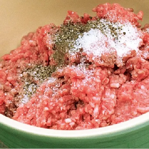 انتخاب گوشت گوسفندی/گوساله با درصد چربی بهینه (20-30%) و ادویههای خاص (زعفران، پیاز، نمک).